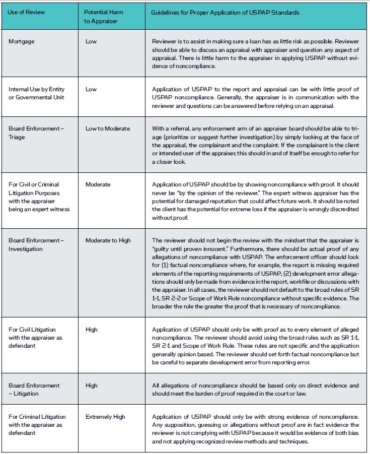 Assume the same appraisal and appraisal report developed and written by the same appraiser is reviewed in the following settings: mortgage lending, board enforcement, civil court proceedings, criminal action, experience credits, to secure a job, and to become approved on an appraiser roster (list). This same report should not be reviewed in the same manner. USPAP is the same, as are all the rules contained in USPAP. However, the proof of noncompliance with USPAP should be under different standards of proof. The application of USPAP rules should change depending upon a multitude of factors.