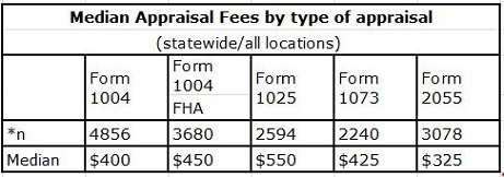 The table below represents the median appraisal fee reported in the survey paid by banks directly to appraisers. (Read the complete fee survey report here).