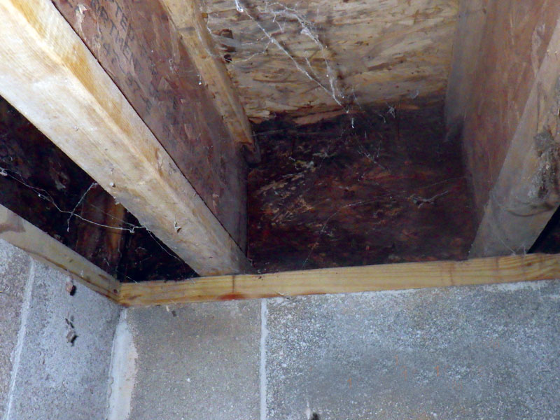 This 20-year-old home was set up for disaster at the onset of construction. With no attention to flashing detail, and no apparent understanding of needing to protect engineered laminated products (OSB, manufactured I-joists, which were the substructure framing), this home started rotting very soon after construction. And unlike old draftier housing stock, this home was less drafty (still drafty, just less drafty). Less drafty means less drying or longer drying time. Prolonged exposure to moisture delaminated the resins/adhesives in the engineered materials, primed the wooden fibers for pest snacking, and degraded the general strength of the framing.