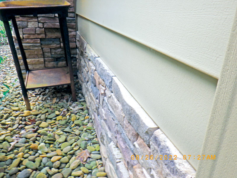 This home in particular was built in the mid-2000s and likely was intended to be a moderate-to-high-end home based on materials used and aesthetic finishes. Composite cement fiber product was used for siding. Concrete cast stone veneer (“lick and stick” as it is so lovingly referred to here) was used for both foundation veneer AND some areas of siding. Where the cement boarding terminated and adjoined the stone veneer, there sat a shelf. A very flat, flat, shelf (See Figure 1: Shelf Between Cement Siding and Stone Veneer).