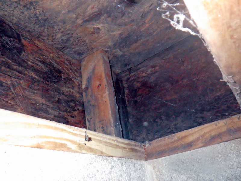 Our flat joint had no special flashing installed. Flat surfaces hold water, or at least don’t let it drain away and off. When water is held flat, it will follow capillarity (think trees) and find other points by which to travel—up, down, and sideways. At our dissimilar joint with no special flashing, the water readily accessed a percentage of the walling assembly over time. Time and moisture vs. (Oriented Strand Board) OSB. Which do you think wins? Hint: pick moisture.