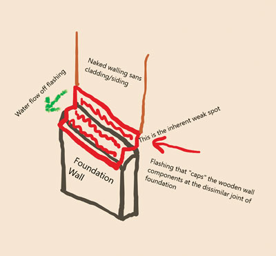 Where that wooden wall ends (you have to picture the wall naked of siding/cladding) the materials are dissimilar (usually wood and concrete or masonry). Dissimilarity, in home performance, is the ideal location for issues to develop—usually via air, moisture, and pests. The solution would be, like roofing, flashing. The problem is that the flashing of wall assemblies and components is not a highly regulated area of home production in our region and, based on what I see often, there is a wide spectrum of understanding and skill by those performing the work.