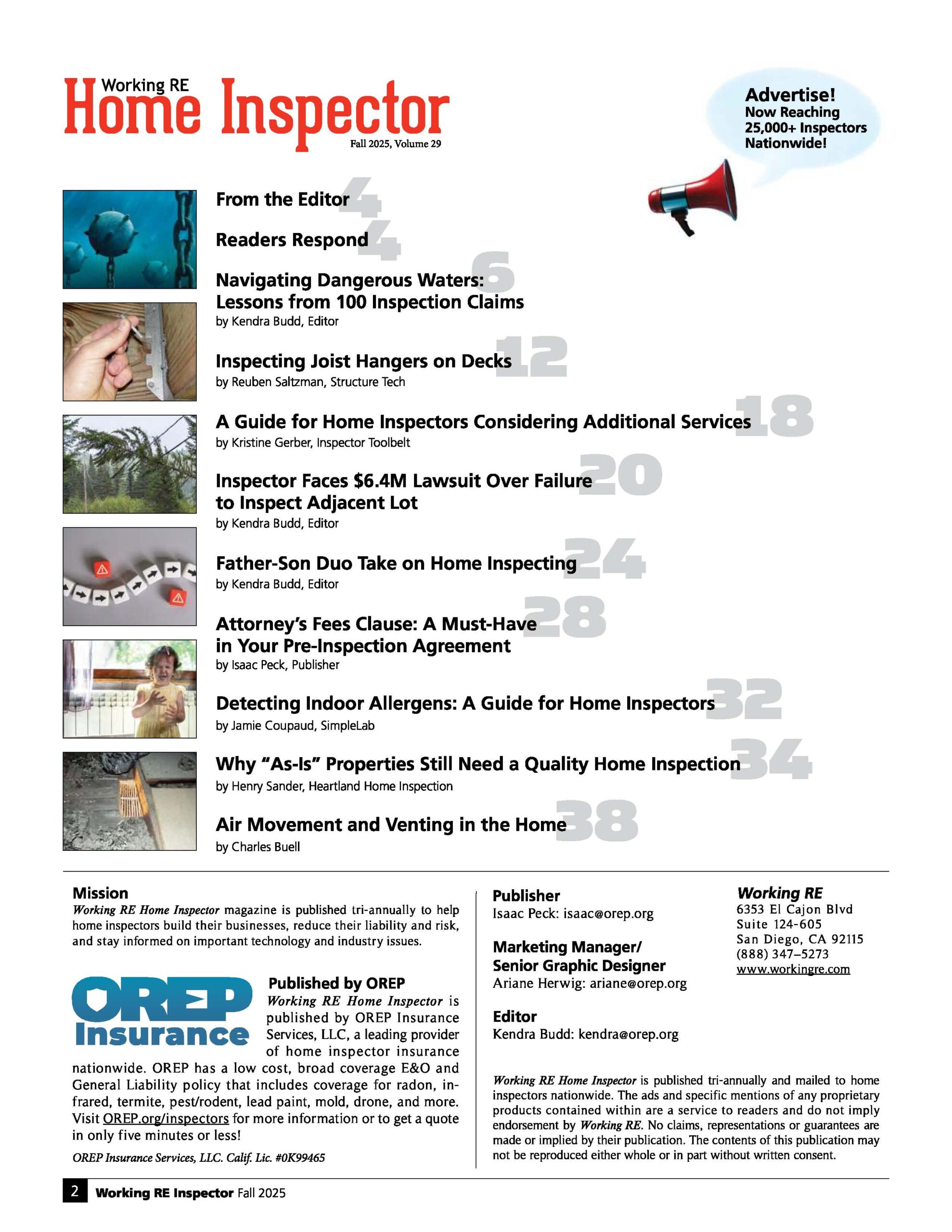 Award winning Working RE Magazine helps home inspectors stay informed and get the most up-to-date home inspector information, advice, news, tips, and training from others in their industry. Working RE magazine is published by OREP, providing a low-cost broad-coverage insurance policy for home inspectors that includes E&O, general liability and many other essential coverages.
