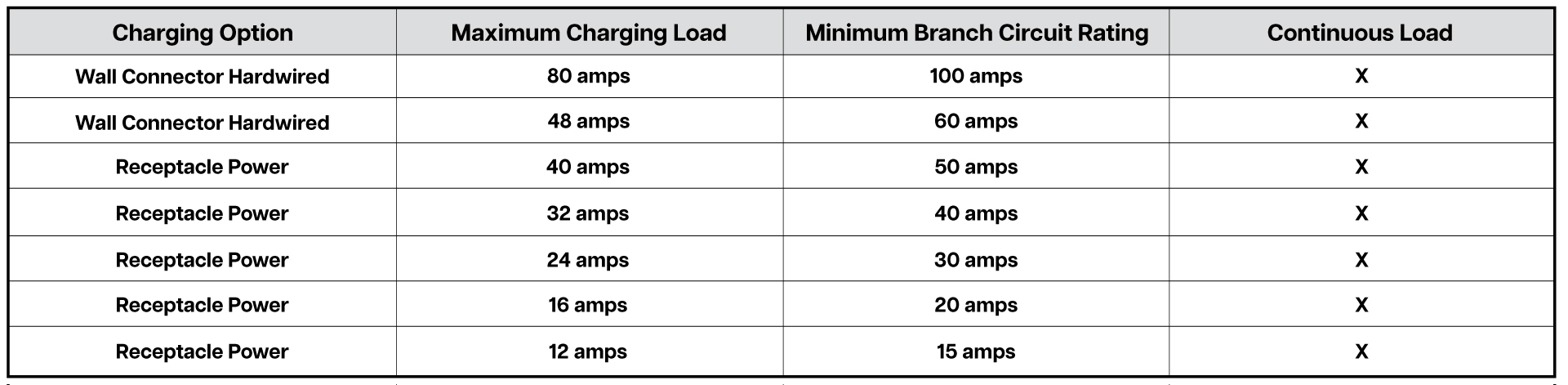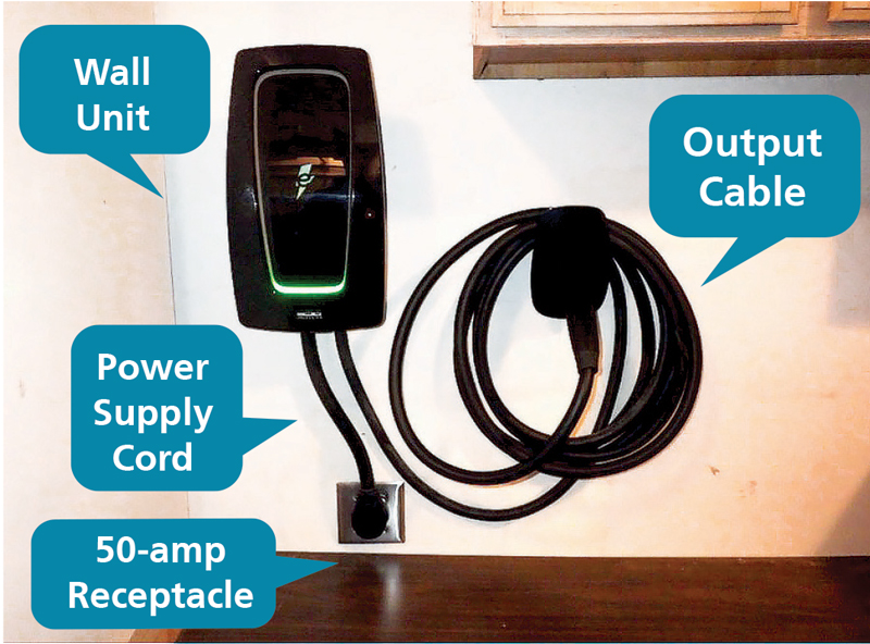 • Wall Connectors: Wall connector units are fixed in place. These are fed with 240–volt or 208–volt supplies. Although more powerful units are available up to 80 amps, many popular residential wall units have a maximum rating of 48 amps. When hardwired and the maximum amperage load is 48 amps, the minimum supply should be a 60–amp circuit. When the unit is plug fed from a 50–amp receptacle and circuit, the maximum load is 40 amps.
