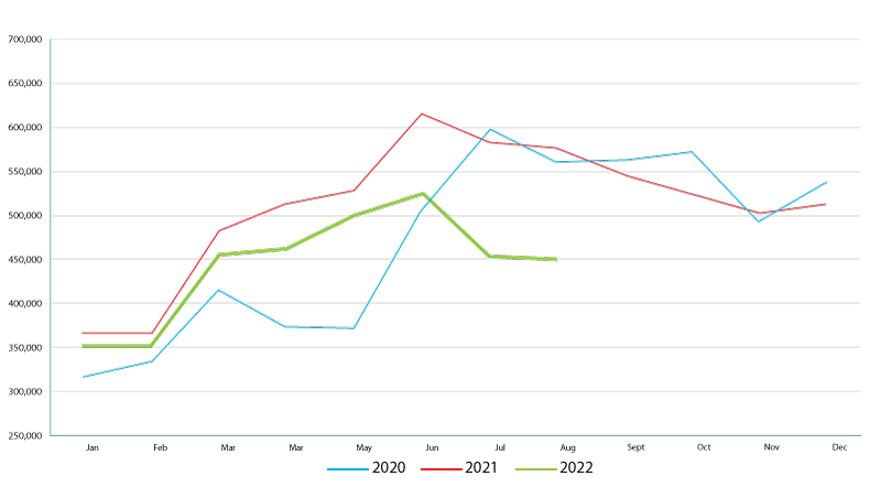 In fact, these are the lowest sales numbers for the month of August that we’ve seen in the last decade—making it the slowest August since 2011. But compared to 2020 and 2021, an even sharper contrast is notable. Figure 1 shows the Existing Home Sales in 2022 compared to the last two years.