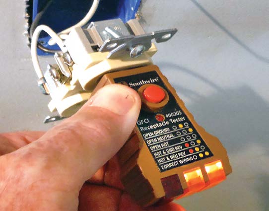The test button on the tester shunts the hot slot to the ground slot through an internal resistor to simulate a ground fault. In a properly wired and grounded receptacle, this test will trip the GFCI protective device. However, if the receptacle is not grounded, the tester will show reversed polarity when the button is pushed, even if the polarity is correct. Then, since there is no ground, the button will not trip the GFCI. The test button on the GFCI device will trip the device even when no ground wire is present. This is why testing with the GFCI device’s built-in test button is preferred (See Figure 7).
