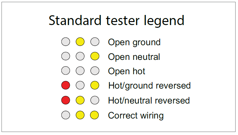 The left side light will illuminate when there is a voltage between the neutral slot on the receptacle and the ground slot. This shows reversed polarity and must have a ground reference to reveal this defect. The center light illuminates when there is voltage between the neutral slot and the hot slot. No ground reference is needed but the polarity could be correct or reversed and the tester would show the same. The light on the right side illuminates when there is a voltage between the hot slot and the ground slot. So, when the center and right side lights are illuminated, the tester indicates that the wiring is correct and working properly. However, when the center and left side lights are illuminated, the tester shows reversed polarity. When only the center light is illuminated, the tester indicates an open ground and a voltage between the hot and neutral slots but does not confirm proper polarity (See Figure 1: Three-Light Receptacle Testers).