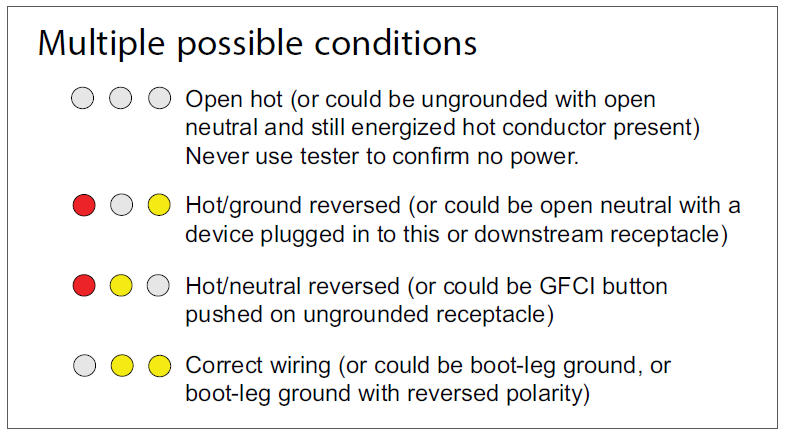 The legend information on three-light testers is sometimes inaccurate and incomplete. At best, they can give an indication that something is wrong, and in some situations, they will not even do that. Never rely on these testers for confirmation to safely work on electrical equipment. For example, no lights do not necessarily mean that the receptacle is not still energized. A dangerous condition is when a bootleg grounded receptacle has reversed polarity (See Figure 3). This condition will energize the metal yoke of the receptacle and the metal chassis or frame of anything plugged into it, while the tester shows “correct wiring.” Refer to Figure 4 for a Standard Tester legend and see Figures 5 and 6 for Multiple Possible Conditions and Other Conditions not listed on the legend.