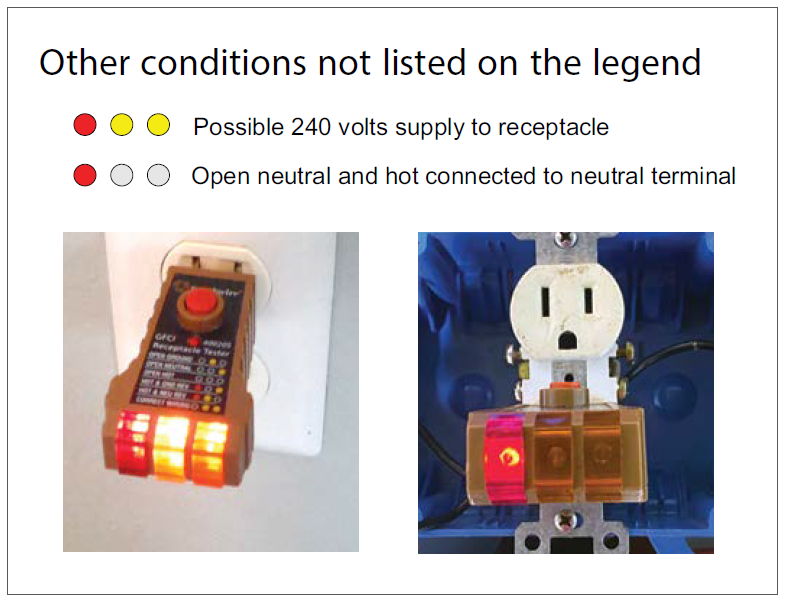 Sometimes, one of the lights may be dimmer than the others. This usually indicates a loose or bad connection. Another dangerous condition that sometimes occurs is when a 240-volt supply is connected to a standard duplex receptacle. The tester will illuminate all three lights when plugged into this receptacle. The center light will be brighter because the voltage to it is 240 volts.