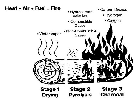 may not cause a fire immediately, a potential hazard still exists. Combustible materials exposed to heat start to pyrolize. Pyrolization is the first step of combustion. The temperatures that start the process of pyrolization are relatively low, in the mid-200 degree range. The more pyrolization that has occurred, the lower the temperature of combustion becomes. Masonry materials absorb heat and continue to conduct that heat to the surrounding materials after the heat source is gone. (See Figure 1, Stages of Combustion.)