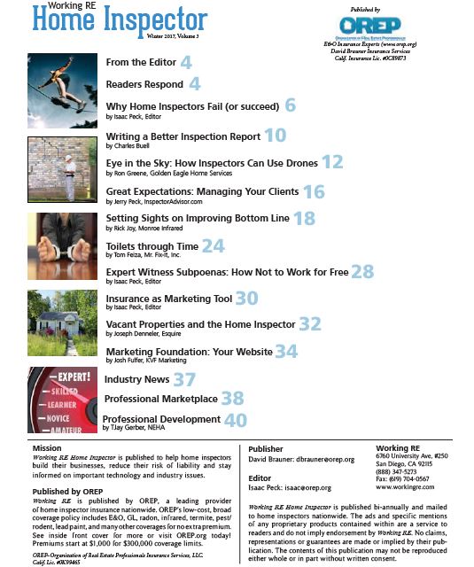 Working RE Home Inspectors is a NEW print publication that will reach over 12,000 Home Inspectors across the country. The second issue mails June 2017!